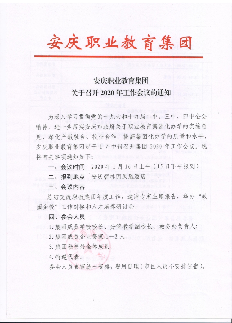 安慶職教集團擬定于2020年1月16日召開集團2020年工作會議,請各參會單位填好會議回執(zhí)(附表),于2020年1月10日上午12點前,發(fā)送至安慶職教集團秘書處郵箱:aqzjlm@163.com。參會回執(zhí)見附件2。