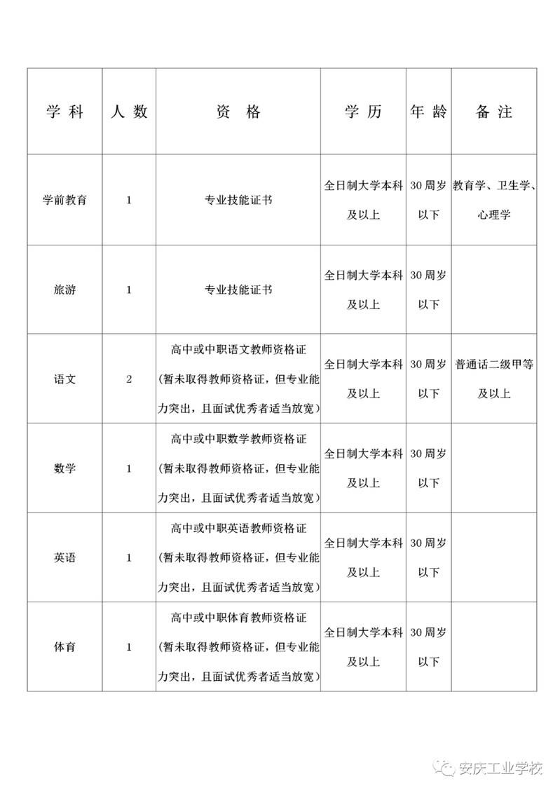 安慶工業(yè)學(xué)校是安慶市教育體育局直屬的唯一一所公辦全日制中職學(xué)校。因教學(xué)需要,面向社會(huì)招聘臨時(shí)代課教師若干名,現(xiàn)將有關(guān)情況公告如下:
