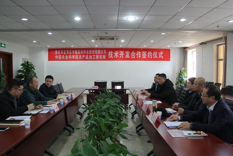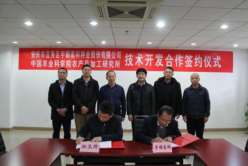 11月27日下午,中國農(nóng)業(yè)科學(xué)院農(nóng)產(chǎn)品加工所與宇順高科種業(yè)股份有限公司簽約儀式在北京舉行。中國農(nóng)業(yè)科學(xué)院農(nóng)產(chǎn)品加工研究所黨委書記王長江、安慶市宜秀區(qū)區(qū)委書記婁雪松、成果轉(zhuǎn)化處副處長常盛、新資源食品研究中心研究員佟立濤、區(qū)農(nóng)業(yè)農(nóng)村局局長潘緒中、區(qū)文化和旅游局局長何反修、區(qū)林業(yè)局副局長李凱以及公司創(chuàng)始人王發(fā)文等出席。