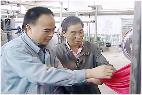 華茂集團(tuán)董事長(zhǎng)倪俊龍與武漢紡織大學(xué)教授徐衛(wèi)林在攻關(guān)現(xiàn)場(chǎng)