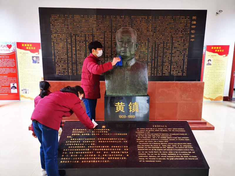 參觀結(jié)束后,同學(xué)們拿起勞動(dòng)工具,自發(fā)的打掃陳列館的衛(wèi)生?!拔以诓潦命S鎮(zhèn)爺爺?shù)乃芟駮r(shí),覺(jué)得黃鎮(zhèn)爺爺在注視著我,他勉勵(lì)我要爭(zhēng)做時(shí)代雷鋒?!眲⒖X同學(xué)如是說(shuō)。