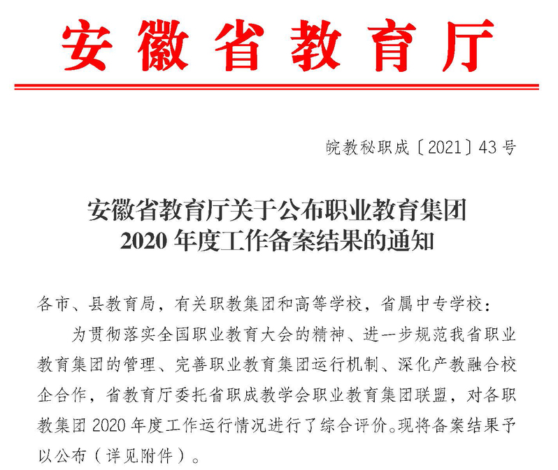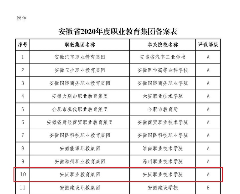 9月8日 ,安徽省教育廳公布了全省47個職業(yè)教育集團(tuán)2020年度工作備案的結(jié)果,安慶職業(yè)教育集團(tuán)再度獲得A等級。