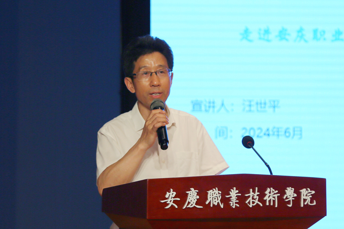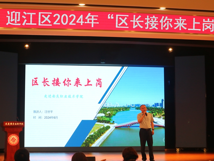 在同學們熱烈的掌聲中,汪世平作了主題為“這里是迎江,歡迎來迎江”的講話。這句話不僅表達了對迎江區(qū)的自豪感,也向在場的所有人,特別是安慶職業(yè)技術(shù)學院的畢業(yè)生們,傳達了開放包容、期待人才加入迎江區(qū)大家庭的信息。他說迎江是一座蓬勃發(fā)展的實力之城,迎江區(qū)綜合競爭力位居全省市轄區(qū)第3名,中國500強的超威、投資超百億的衡川、全省民營企業(yè)100強的運通達都深耕在迎江;他說迎江是一座蓬勃發(fā)展的實力之城,人才政策“再”加持,休閑配套“超”豐富,提供多項就業(yè)創(chuàng)業(yè)補貼和就業(yè)創(chuàng)業(yè)服務(wù)。3年來,超過4600名大專以上的人才扎根迎江,超過150名安職院畢業(yè)生留在迎江,歡迎同學們落戶迎江、服務(wù)迎江、扎根迎江。
