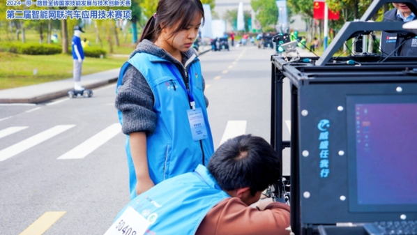 大賽首日,新能源汽車仿真賽項拉開帷幕。參賽選手們需要在限定時間內(nèi),通過計算機仿真技術(shù)模擬新能源汽車的運行狀態(tài),對車輛性能進行仿真分析和優(yōu)化。次日,新能源汽車裝調(diào)賽項火熱進行,該賽項要求選手們對智能網(wǎng)聯(lián)汽車進行細致的裝配、調(diào)試和標定,確保車輛各項功能正常運行。大賽最后一天,車路協(xié)同賽項成為焦點。該賽項要求選手在規(guī)定時間內(nèi)完成智能路側(cè)端設(shè)備的安裝、調(diào)試、通信連接、故障排除。張晴晴和彭耀祥展現(xiàn)出卓越的技術(shù)水平和團隊協(xié)作能力,精心裝配,耐心調(diào)試,確保每一環(huán)節(jié)都達到最佳狀態(tài)。